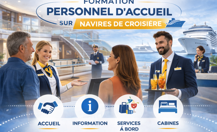 La formation Personnel d’Accueil sur les Navires de Croisière, diplôme accrédité, prépare les apprenants à devenir des professionnels du service à bord, capables d’assurer l’accueil, l’assistance et le confort des passagers durant toute la croisière. Cette formation est reconnue pour la qualité de son enseignement et conforme aux standards internationaux du tourisme maritime et de l’hôtellerie à bord.